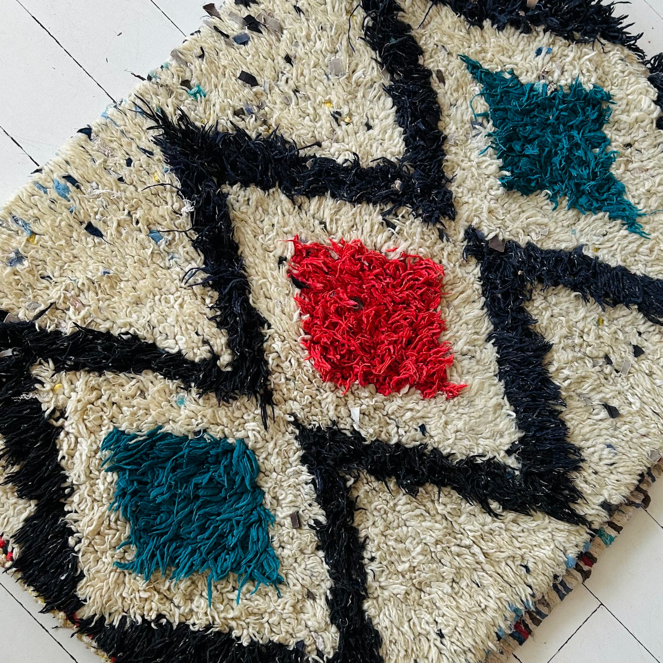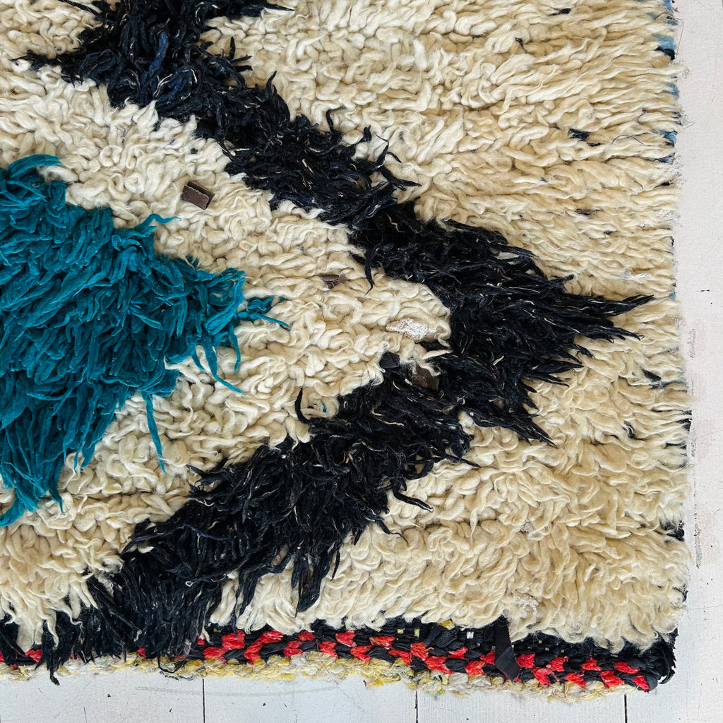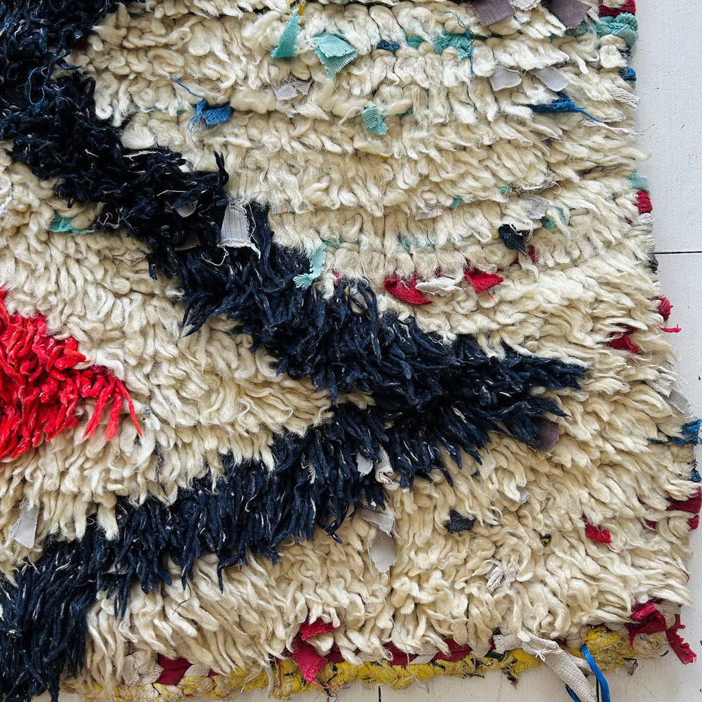 This vintage Boucherouite runner was hand-knotted in Morocco using wool and cotton, with a low, lightweight pile. With its soft cream background and teal and red diamond motifs, this runner brings colour and pattern without feeling heavy. It’s a relaxed, practical piece with plenty of personality, and perfect for a hallway, galley kitchen, or bedside. Measures approximately 2’6” × 6’2”.