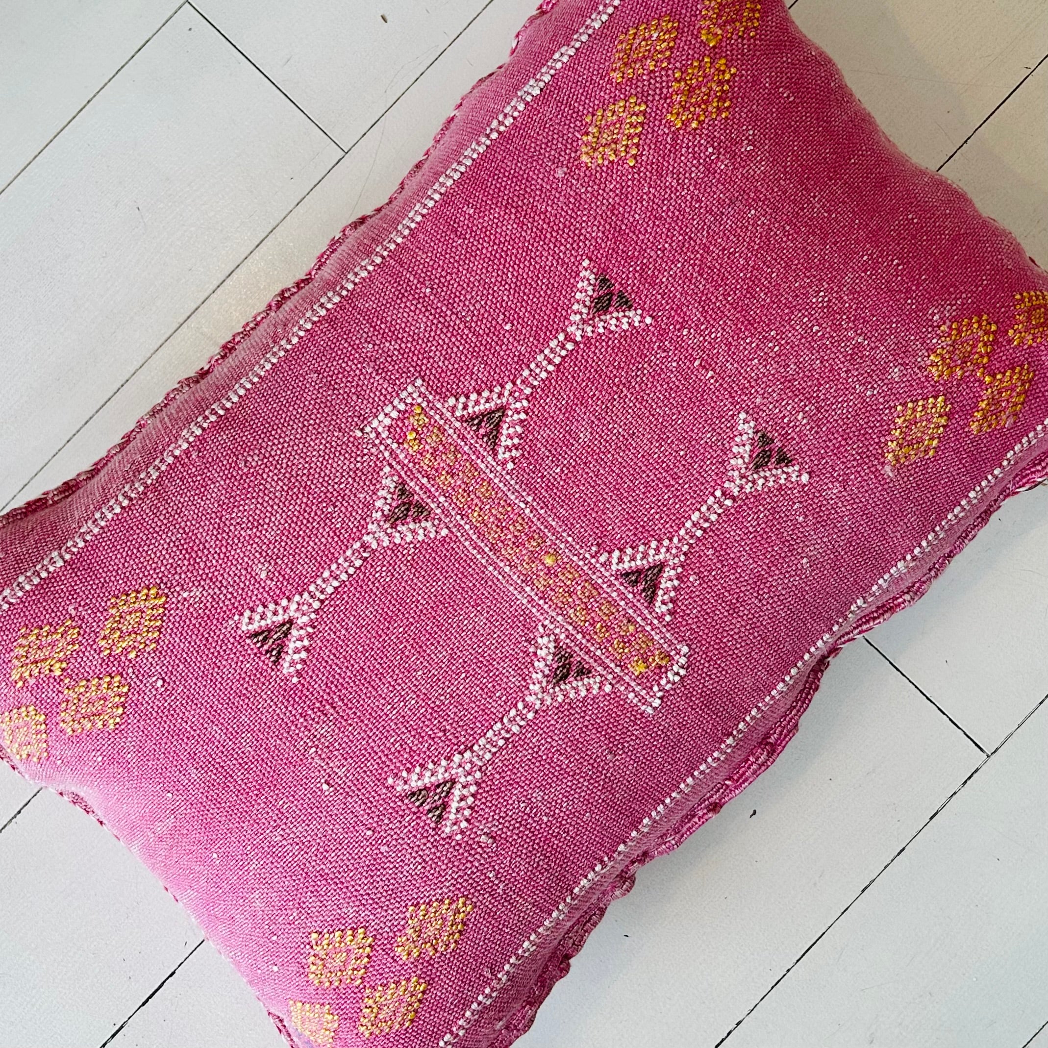 Our gorgeous hand-loomed ‘Cactus Silk’ Cushions look absolutely stunning on a bed, sofa or chair. Add colour, character and charm to your home with these coveted cushions. Each is one-of-a-kind unique and we've called this one ‘Peony’. Our lumbar covers measure approximately 14” x 22” with slight size variations due to their handmade nature. Zipper enclosure along one side. Sold stuffed or unstuffed. We recommend, and have used, a luxuriously soft and plump, 16” x 24” synthetic down insert for this cover. The insert can be machine washed and dried; the cushion cover should be dry-cleaned to prevent colour bleeding.