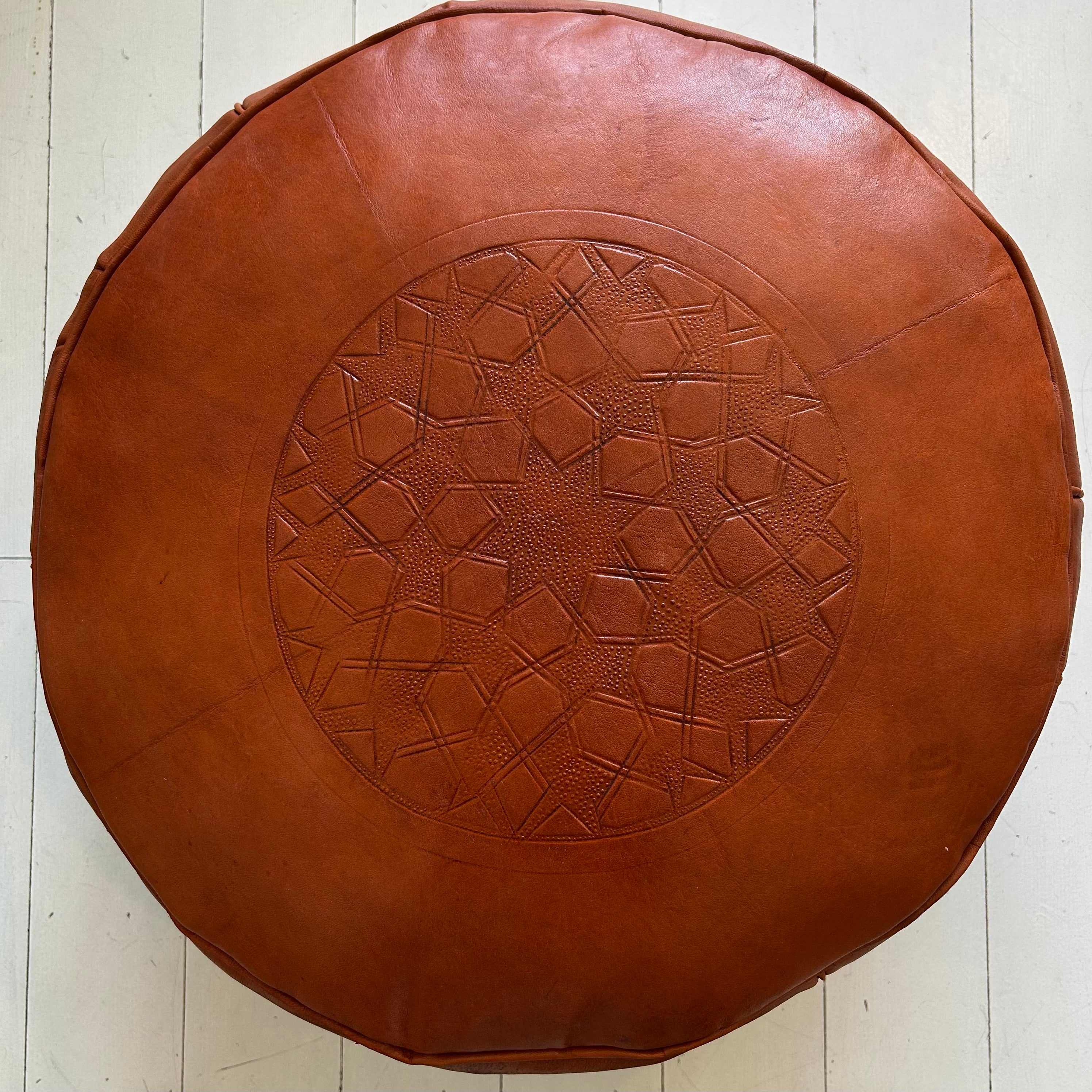 *There are slight colour variations between the pouffes, as they are all handmade using naturally tanned and dyed leather. As these are dyed without the use of chemicals, prolonged exposure to the sun will cause fading, and the colour is prone to spotting if it comes in contact with liquids. This natural leather ages beautifully and takes on its own unique patina.