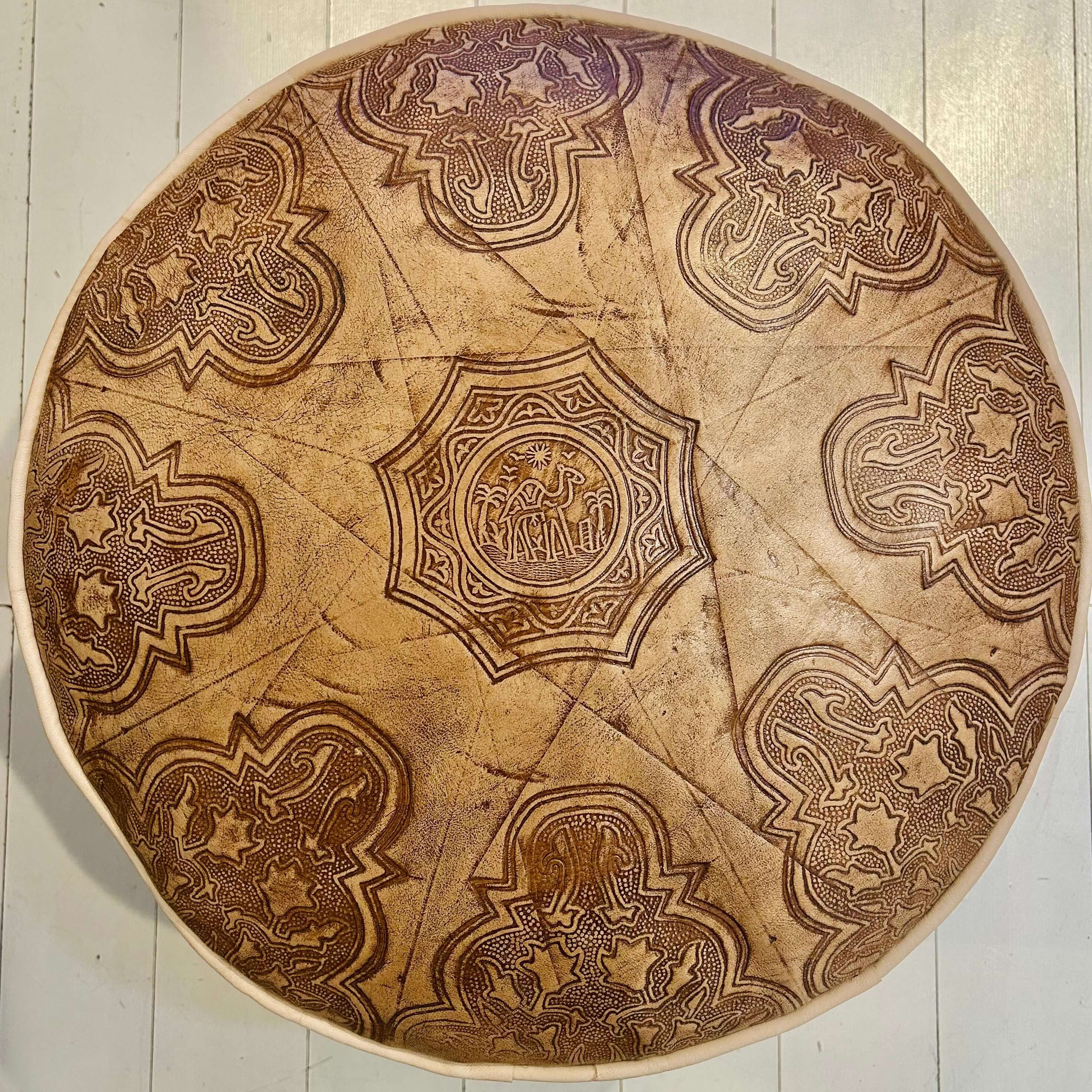 Perfect Pouffes! Handmade in Fez, Morocco, from genuine naturally tanned leather, this embossed pouf features a beautifully detailed camel motif on the top. Versatile and functional, it works perfectly for seating, as a footstool, or even as a convenient side table. The zippered bottom allows for easy stuffing with old clothes, sheets, towels, or crumpled newspaper. Sold unstuffed or stuffed (we use densely packed crumpled newsprint for comfortable, durable support). Measures approximately 19” wide x 15” high.
