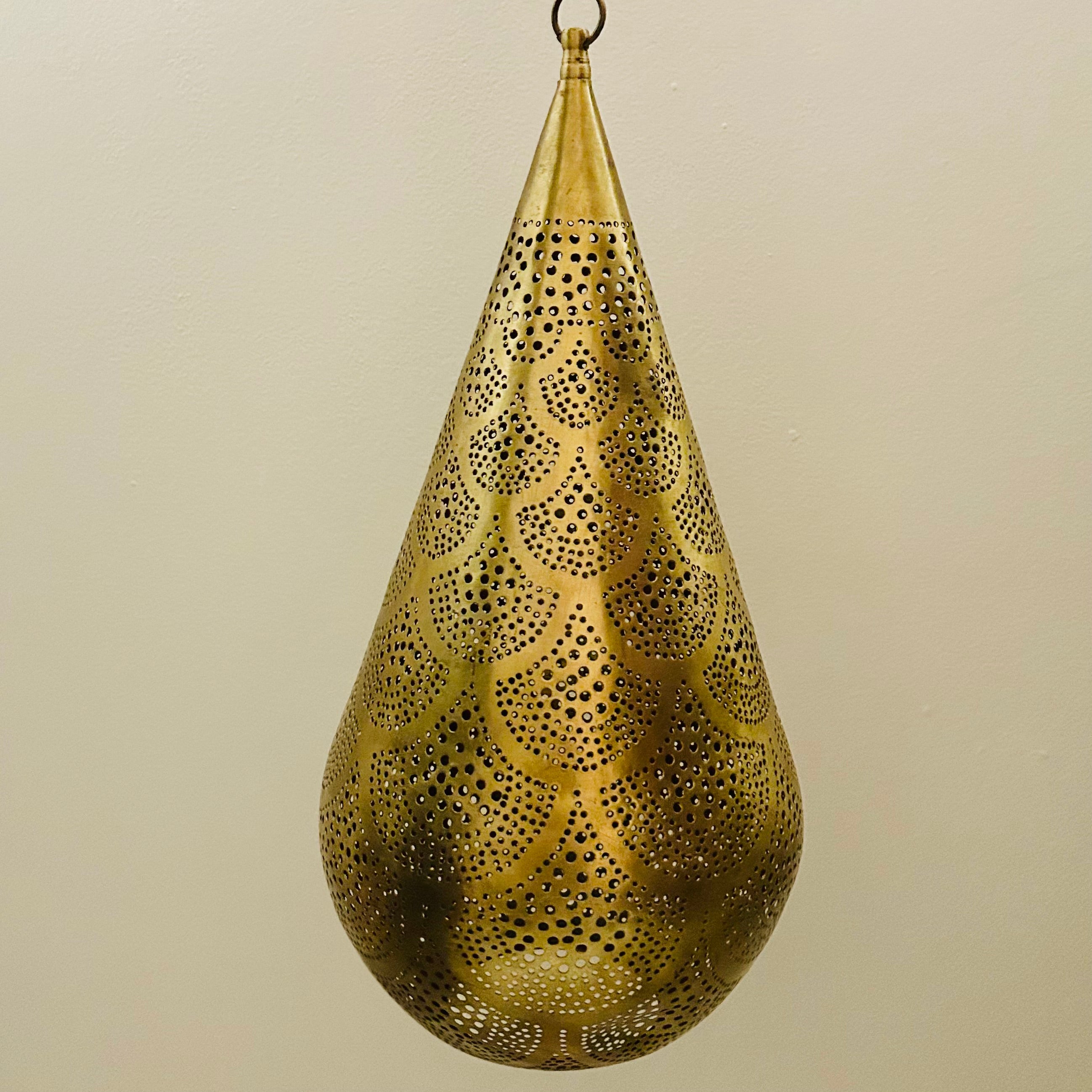 This handcrafted brass lantern, with its gently flared silhouette, combines elegance with exotic Moroccan charm. Measuring approximately 8.5” (22 cm) wide and 18” (45 cm) high, with an additional 8” (20 cm) for the hanging chain, it provides both ambient illumination through its intricate cutout patterns and a soft pool of downward light from its open bottom. Hand-tooled by skilled artisans, it makes a captivating addition to a hallway, bedside, or intimate tabletop display. Perfect as a singular statement, it also inspires creative arrangements when used in multiples.
