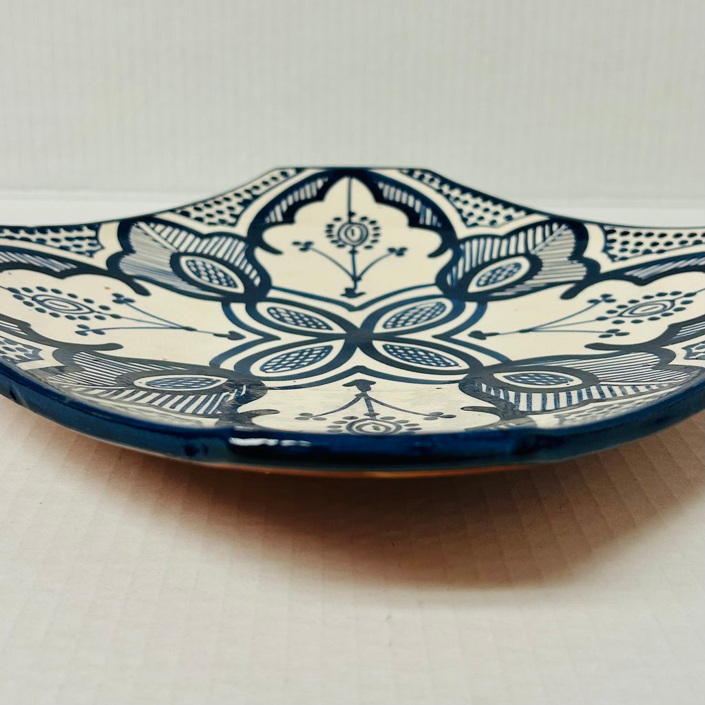 Handcrafted in Safi, Morocco, this square serving dish is made from the region’s distinctive red terracotta clay, shaped and hand-painted by skilled artisans. Finished in classic white with a blue design.