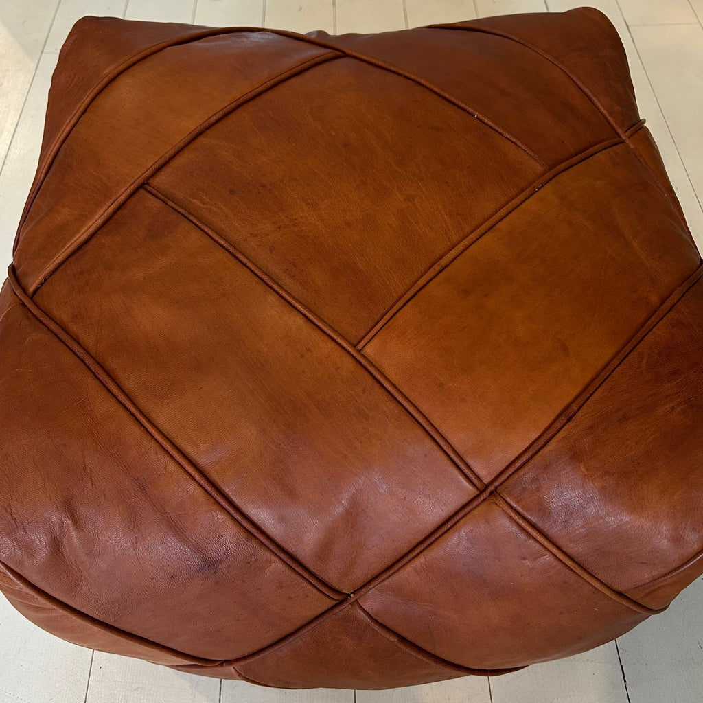 Perfect Pouffes! Our square Moroccan pouffes in 'Canyon’ feature a ‘patchwork’ design with detailed piping on all edges. They're perfect for seating, footstools, or convenient low side tables. Handmade in Morocco from 100% genuine leather, these are a must-have! The zippered bottom makes for easy stuffing, using either old clothes, sheets, towels or crumpled up newspapwr. Sold stuffed or unstuffed (we use densely packed crumpled up newsprint). Add charm and functionality to your home with one of these awesome pouffes. Measures approximately 20” square x 14” high.