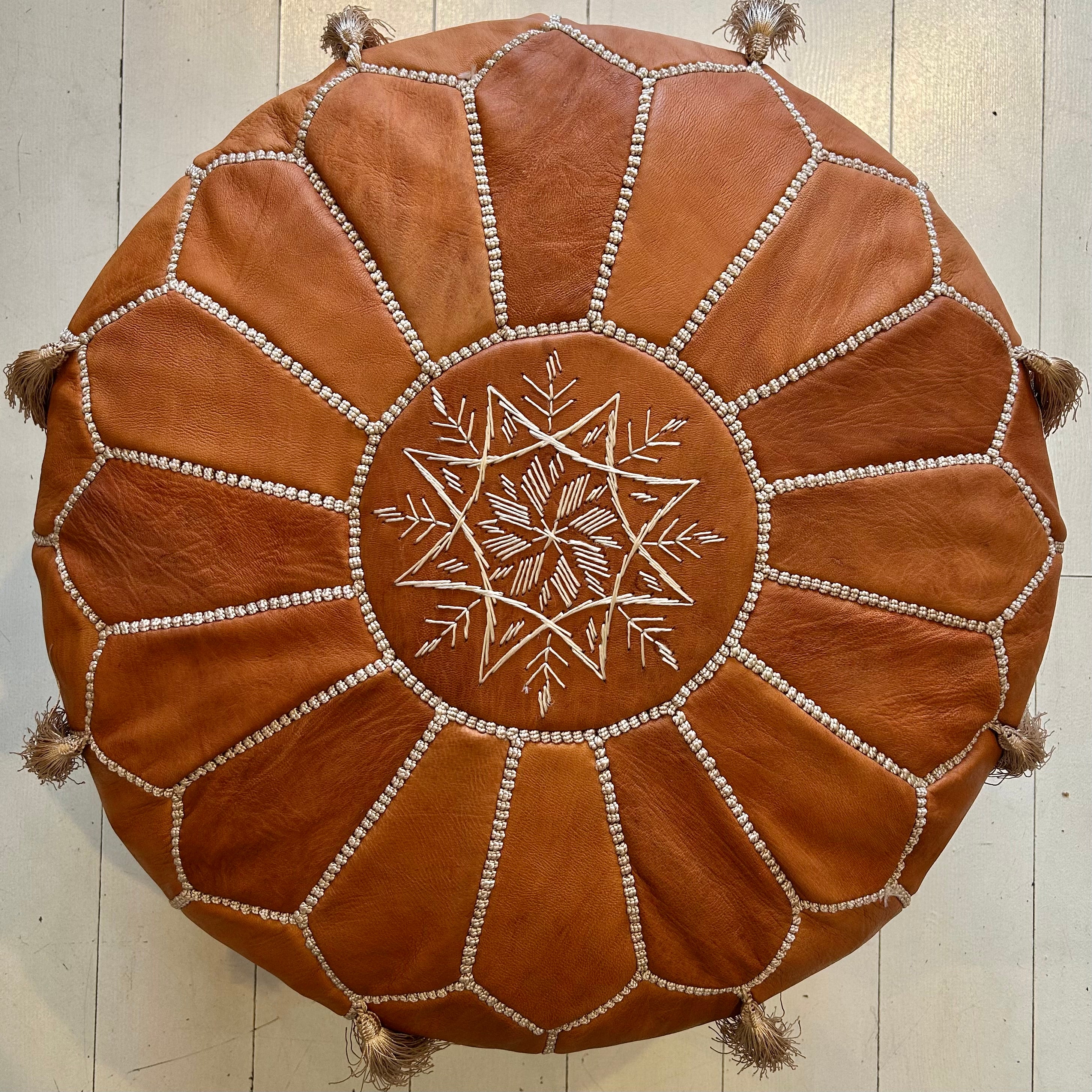 Perfect Pouffes! Our tasselled embroidered Moroccan pouffes in ‘Desert Sand’ are perfect for seating, footstools, or convenient low side tables. Handmade from 100% genuine leather, these are a must-have! The zippered bottom makes for easy stuffing, using either old clothes, sheets, towels or crumpled up newspaper. Sold stuffed or unstuffed (we use densely packed crumpled up newsprint). Add charm and functionality to your home with one of these awesome pouffes. Measures approximately 22” wide x 12” high.