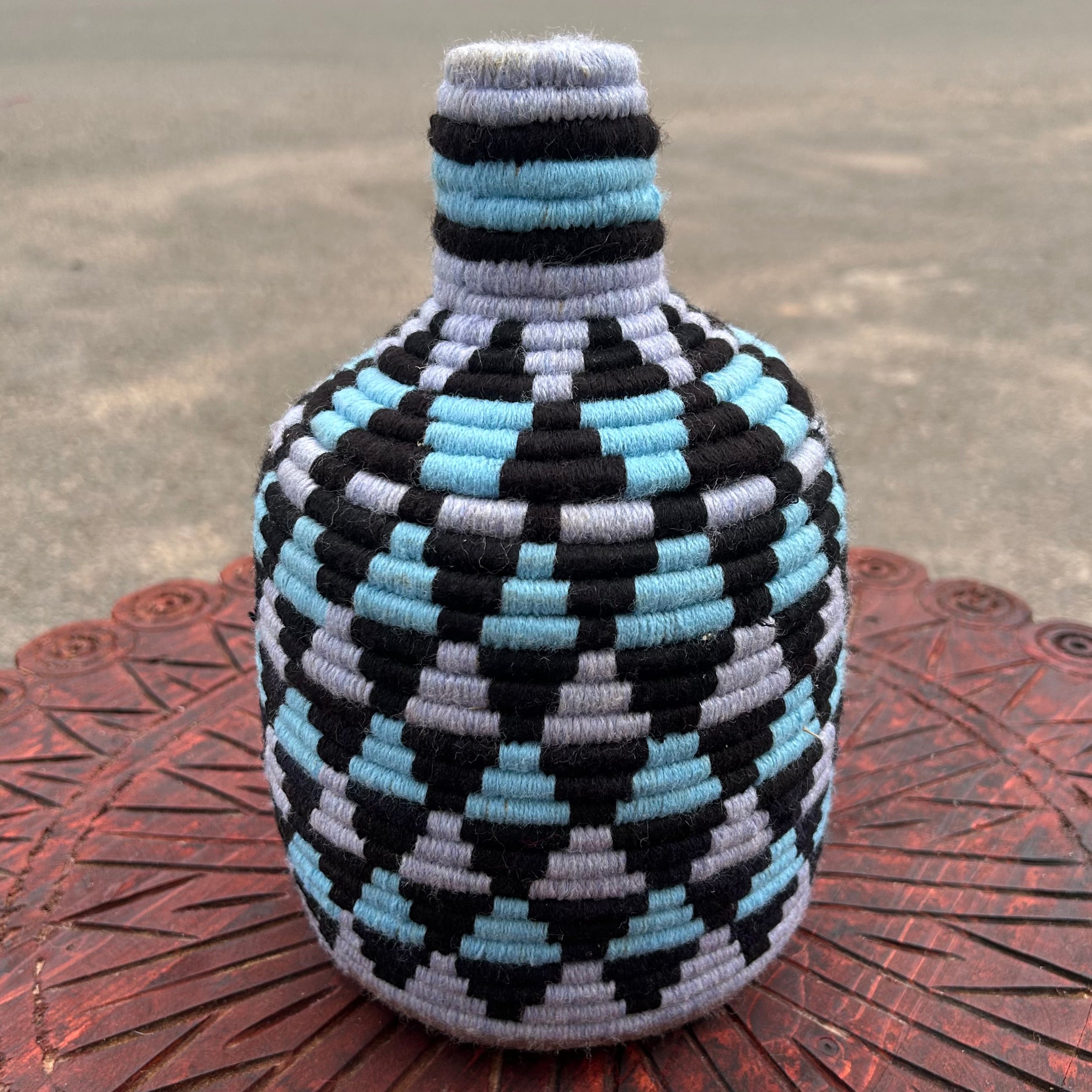 Our colourful handwoven wool/doum baskets from Marrakech add beautiful boho charm to any room.  Traditionally used as bread baskets, they are also perfect for stashing charger cables, keys, odds and ends...you name it!  Fun and functional in any room of your home.  No two are alike; each is a one-of-a-kind piece.  Approximately 11” high.